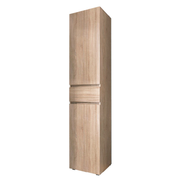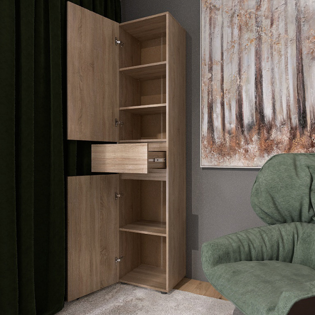 Модель оснащена удобными закрытыми полками и двумя дверцами, что позволяет аккуратно разместить личные вещи или документы. Выдвижной ящик добавляет практичности, а лаконичный дизайн легко сочетается с любым интерьером. Изготовленный из ламинированной ДСП от Swiss Krono, этот пенал отличается высоким качеством и приятным внешним видом.