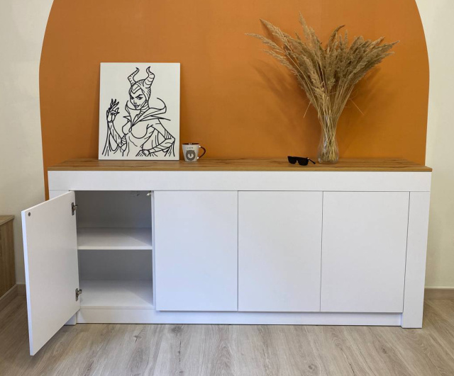 Комод изготовлен из высококачественной ламинированной ДСП от производителя Swiss Krono, что гарантирует износостойкость и длительный срок службы. Конструкция на царгах обеспечивает устойчивость, а четыре дверцы позволяют удобно зонировать внутреннее пространство для хранения разных вещей.